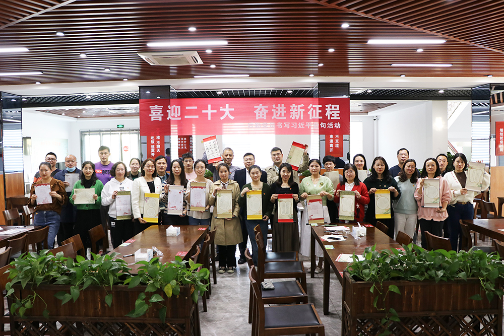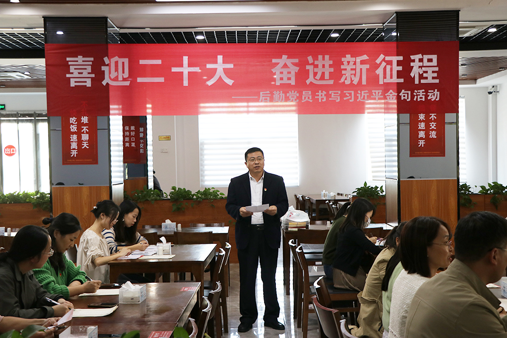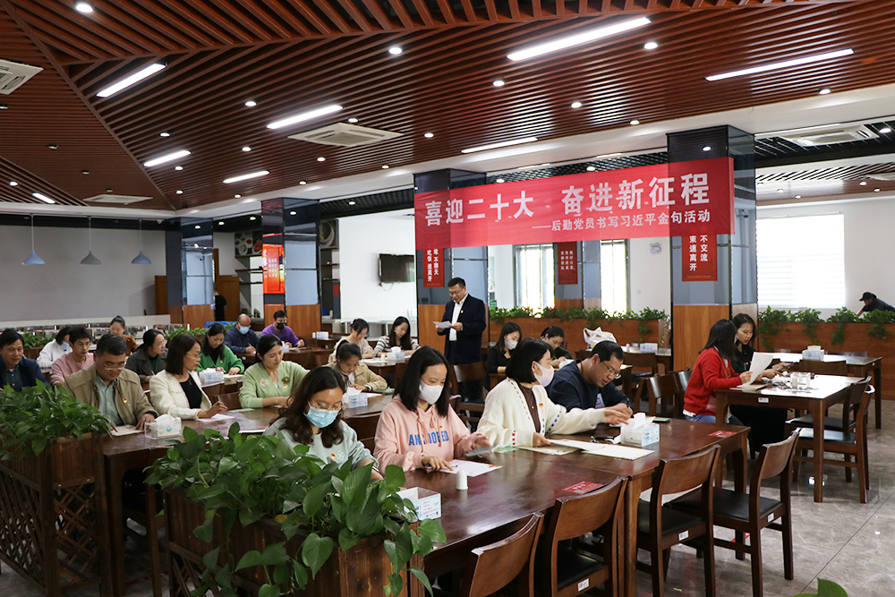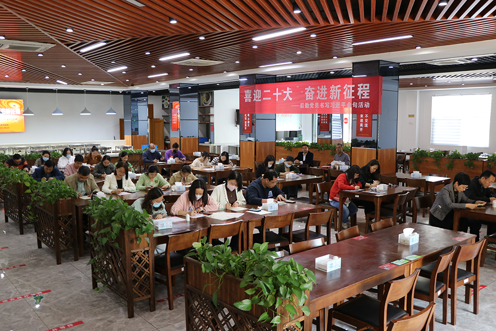 为深入学习贯彻习近平新时代中国特色社会主义思想,大力营造学习党的创新理论、迎接党的二十大的良好氛围。10月13日,后勤党总支在教工餐厅举办“喜迎二十大 奋进新征程”——书写习近平总书记金句主题党日活动,后勤全体党员参加了活动。