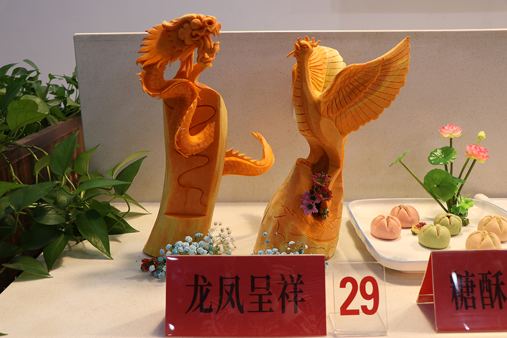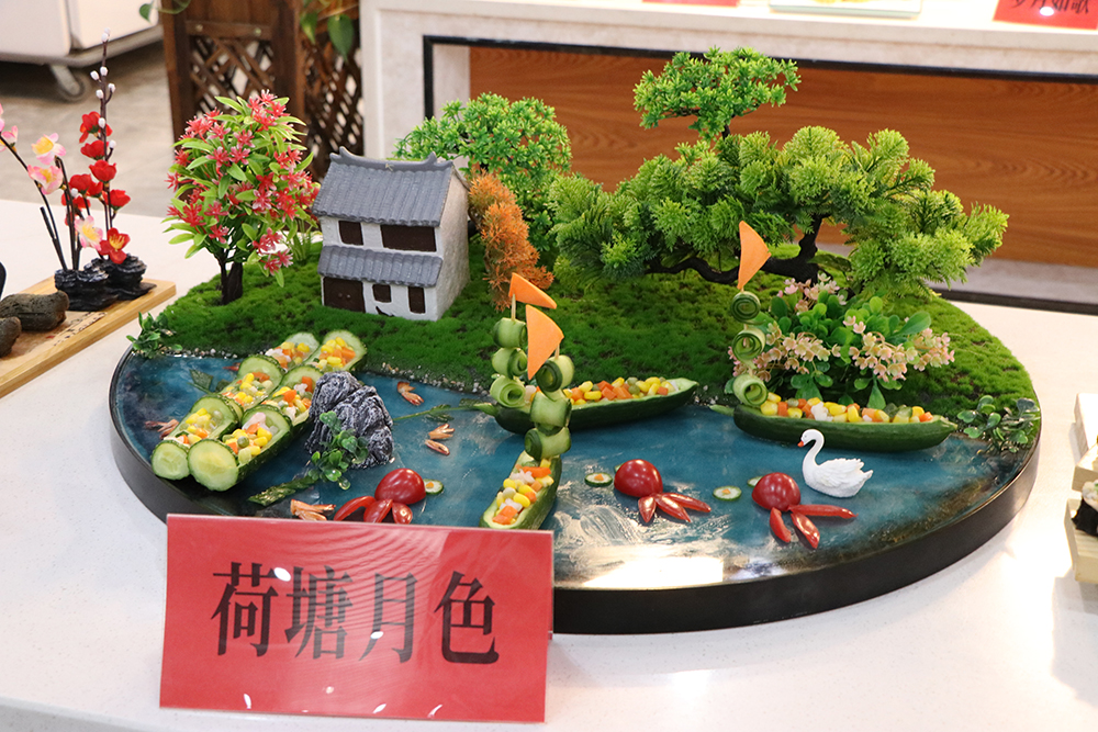 本次比赛分为特色品种、白案、红案三个组别。特色品种、红案会场设在教工餐厅,白案会场设在南苑餐厅。特色品种比赛现场,自营食堂和协作单位各显其能,29项特色创新菜品争奇斗艳、夺人眼球。其中,“孔雀迎宾”冷拼雕刻作品,最为抢眼,虽采用普通食材,但经过精心创作,成为一件精美绝伦、栩栩如生的艺术品;“草船借箭”拼盘让众人惊叹不已,菜盘是一艘木制的小船,“诸葛亮”气定神闲地站立船头,桅杆间用新鲜大虾做的一个个金黄色“稻草人”,再现了三国时期诸葛亮草船借箭的故事。红案比赛品种,为“醋溜土豆丝”、“宫保鸡丁”两道指定热菜。白案比赛品种为“鲜肉大包”,10名点心师、12 名厨师严格按照比赛规程和操作规范,全身心投入,匠心独具,纷纷亮出自己的绝活,展示自己的精湛厨艺。评委从参赛作品的制作工艺、厨艺技能、形态色泽、造型美观等方面进行了认真细致的评选,分别评出三个组别的一、二、三等奖。