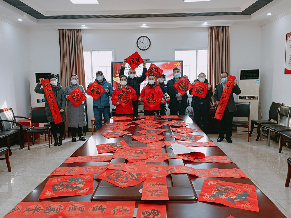 活动中,支部党员马祥甸、书法爱好者胡建明带头创作,党员们围站两旁,仔细观摩,时时发出赞美之声。不一会儿,一幅幅书写工整、行云流畅的对联、一个个吉祥如意的“福”字铺满了桌面,活动现场氛围浓厚,一片欢声笑语。