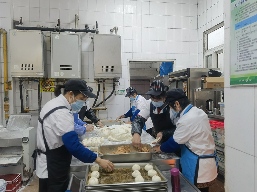 放假前夕,饮食服务中心早早地把为老师们预订包子、熟菜的服务通知挂在网站上。学生一放假,点心间师傅们已经热火朝天地忙碌起来,和面、发面、包馅、醒发、蒸制……师傅们分工明确,各司其职,随后,一笼笼新鲜的包子展现在大家面前,中心管理人员也齐上阵,分类、点数、装袋、贴标签、分发摆放……大家相互配合,圆满完成每天的包子加工任务。