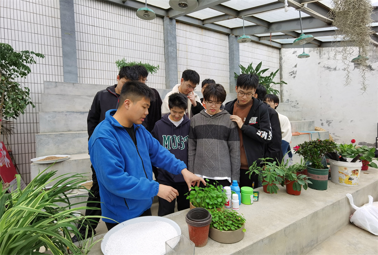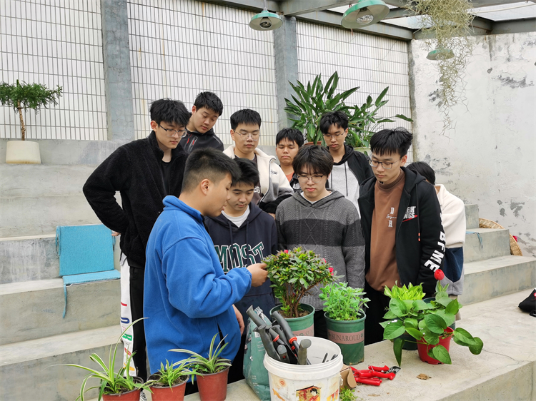 课堂上,花圃基地负责人翟志程对播种、分株、压条、扦插、嫁接等花卉绿植繁殖技术进行重点教学,同时他现场给大家演示吊兰分株、月季和多肉扦插、绿萝压条等培植方法。在现场实践操作中,同学们按照要求分组完成配土、盛土、装盘、栽种、浇水、标签插放等实践操作。