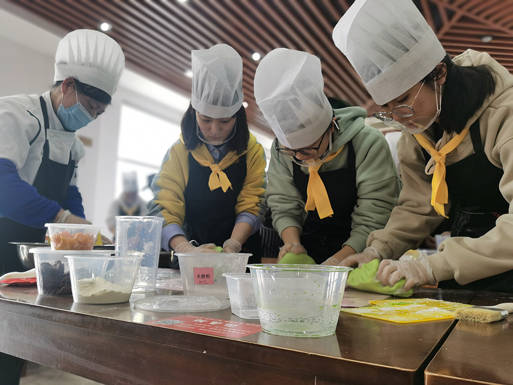 随后,同学们按照厨师着装规范,戴好帽子、围裙,饮食服务中心副经理王莲琴现场讲解了青团的历史渊源及各地青团的介绍,青团的食材原料和制作步骤以及青团的营养价值和食用小贴士。面点师殷春现场演示详细讲解青团的制作要点,包括调制青汁、面团的揉搓方法、手工馅料包制及青团蒸制方式等。