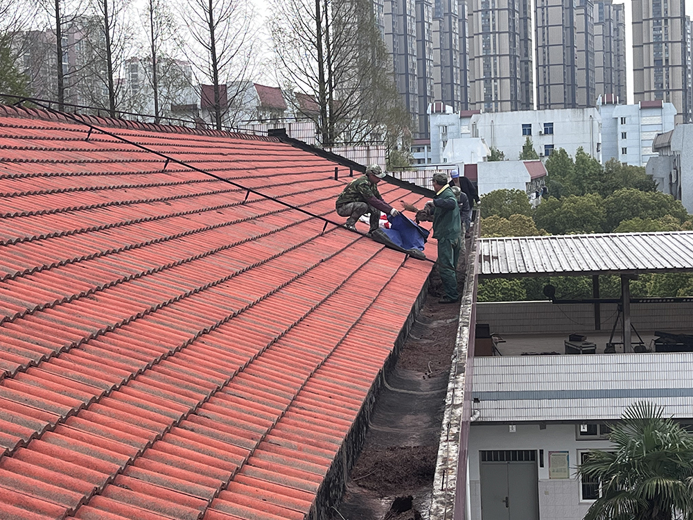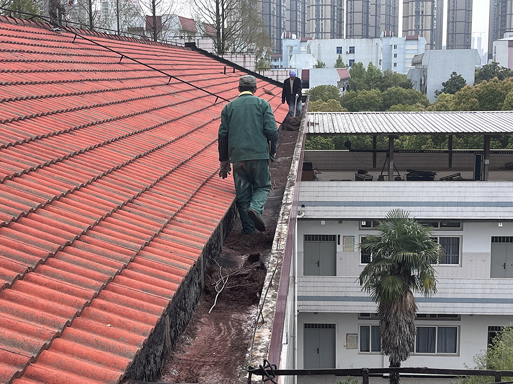 近日,校园服务中心协作单位绿化队员工经过一个多月的辛勤劳动,顺利完成全校屋顶天沟清理工作。