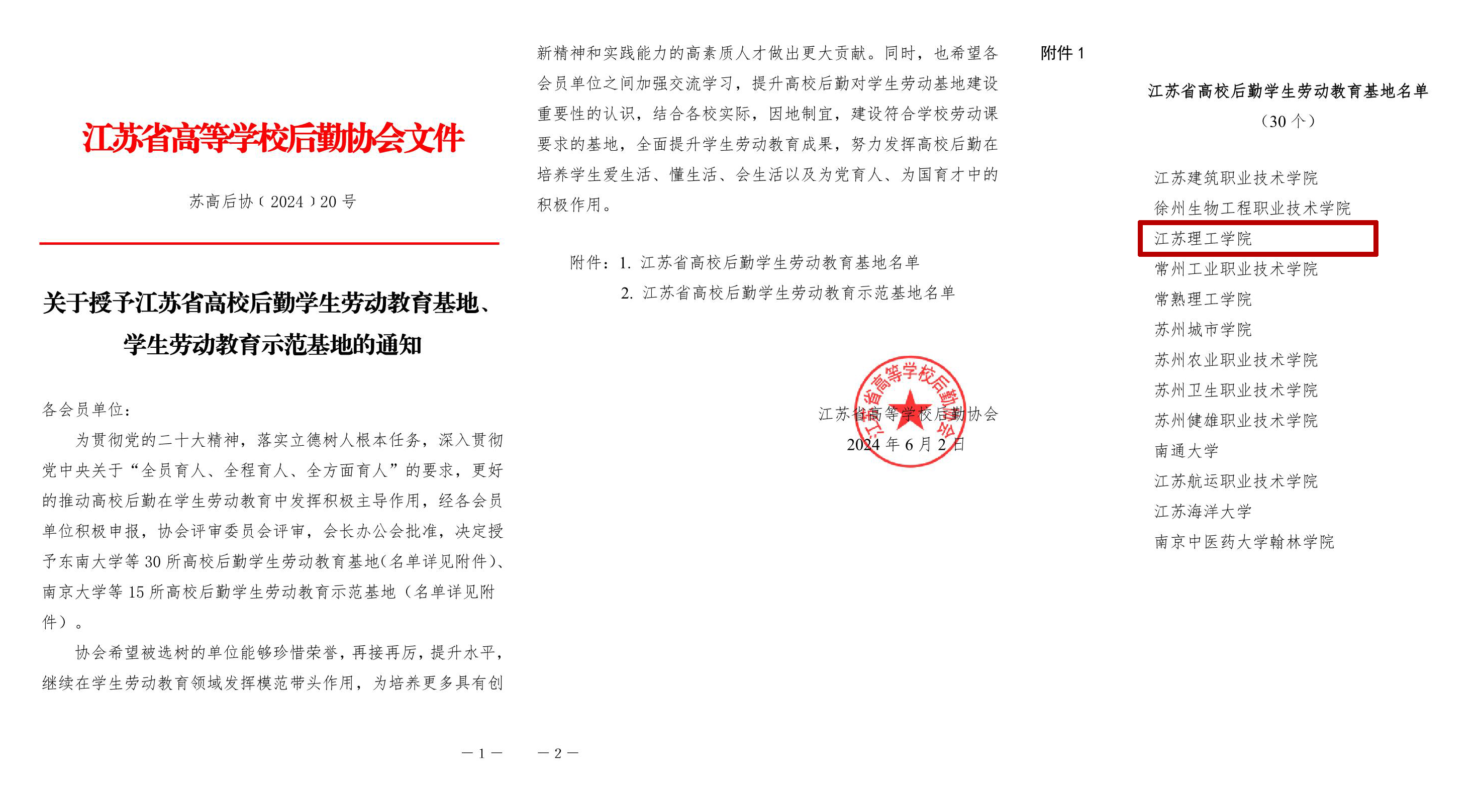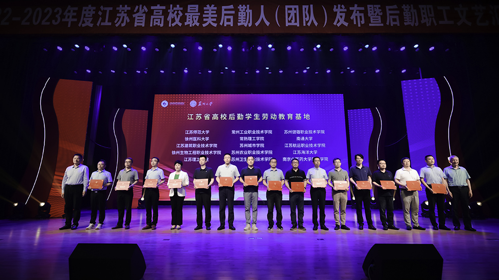 近日,2022-2023年度江苏省高校最美后勤人(团队)发布暨后勤职工文艺汇演在苏州召开,会上宣读了《关于授予江苏省高校后勤学生劳动教育基地、学生劳动教育示范基地的通知》,我校被授予“江苏省高校后勤学生劳动教育基地”称号(全省共45所高校入选,在常高校仅2所入选)。