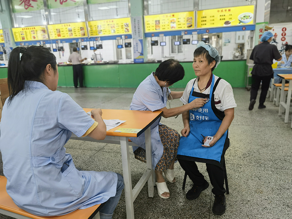 9月5日,常州市鼎武医院的医务人员早早地到达了北苑食堂,为校内学生食堂及协作经营单位的150余名餐饮从业人员分别进行内科、皮肤、DR胸片、肠检、ALT、甲/戊肝抗体等项目的检查;同时,通过体检可以达到“早诊断、早预防、早治疗”的目的,确保餐饮从业人员持有效健康证明上岗。