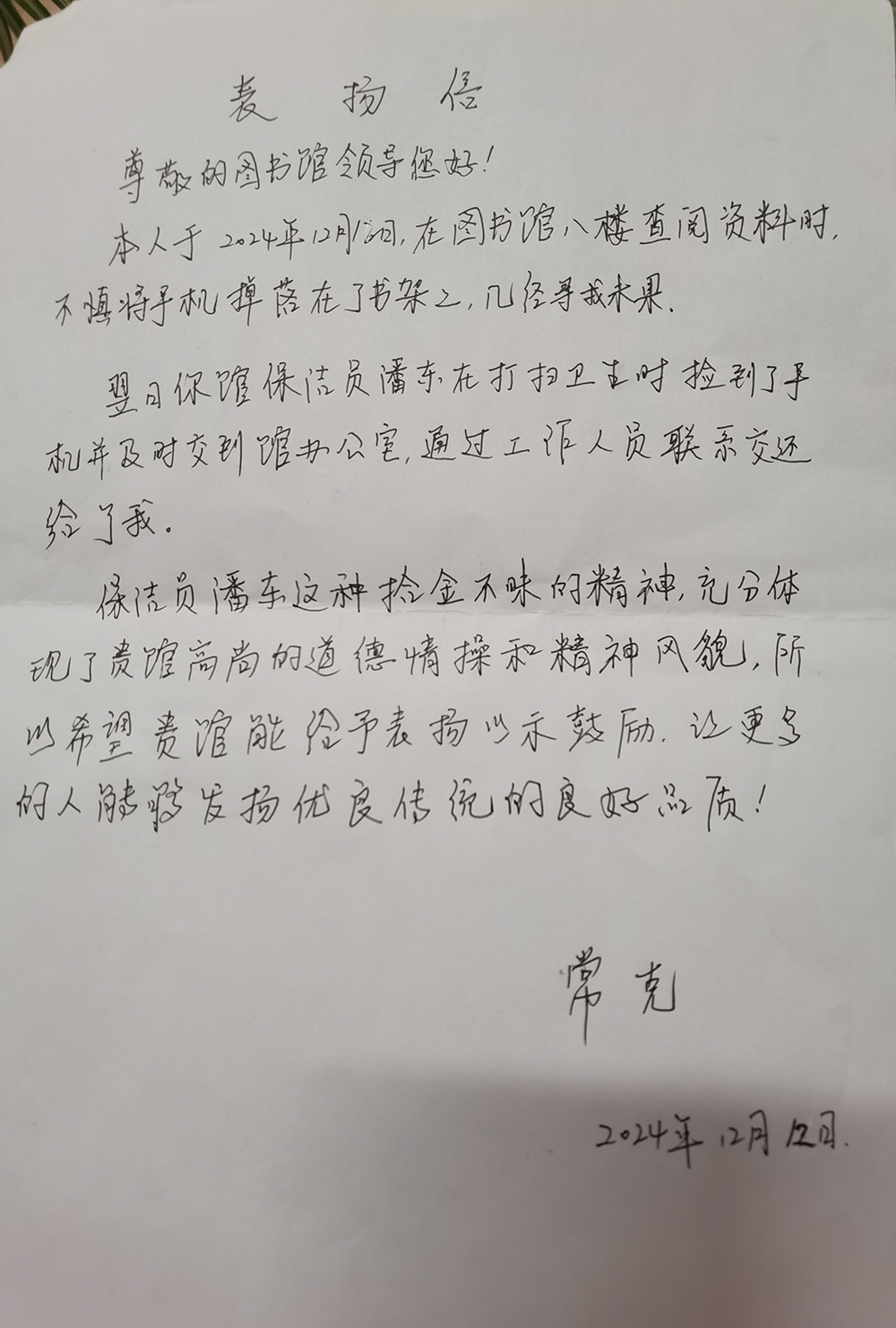 与此同时,图书馆保洁员潘东在擦拭书架时发现了这部手机,询问周边同学无果后,她立即将手机送至大厅门岗处。经多方努力,手机最终物归原主。失主欣喜不已,买水果致谢被拒后,送来感谢信,对潘东及后勤保障处表达感激之情。