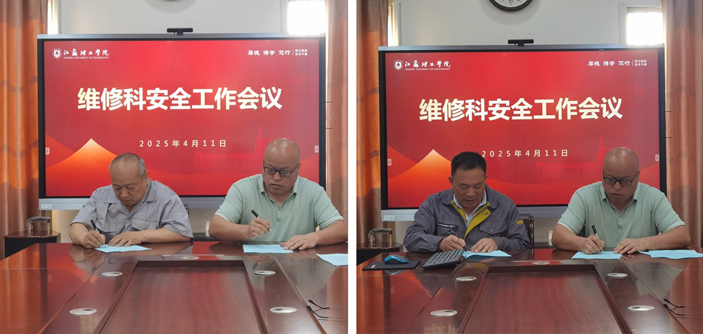 会议上,何宁军宣读了党委办公室、校长办公室关于印发《江苏理工学院安全稳定责任制实施办法》的通知。他强调,维修科要定期开展安全教育和安全培训,水电维修工要提升自身的专业技术能力、加强日常检查与维护及规范操作流程。随后,何宁军代表维修科分别与水、电班组组长签订安全生产与管理责任书。