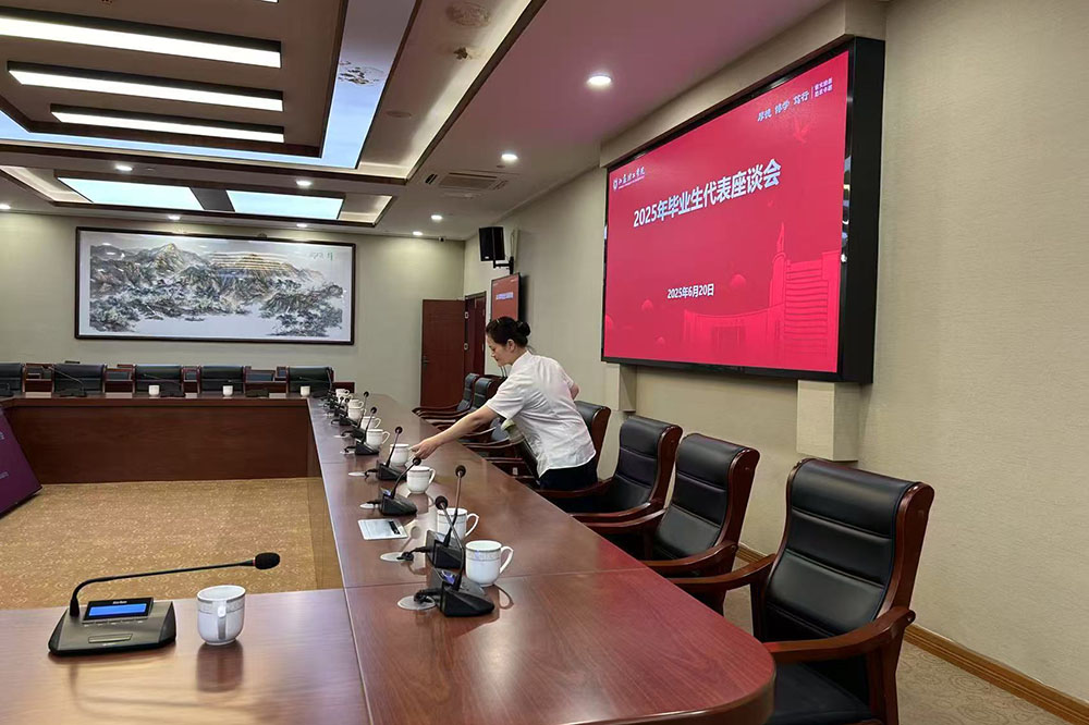 在毕业生离校期间,场馆会务中心统筹协调场地资源,先后服务保障了校友座谈会、毕业生代表座谈会、及各学院毕业生会议等多场大型活动。面对期间高密度、高标准的服务需求,中心全体工作人员加班加点,从场地布置、设备调试到现场服务,均做到细致入微,尽量满足各项需求,确保每场活动顺利进行的同时。
