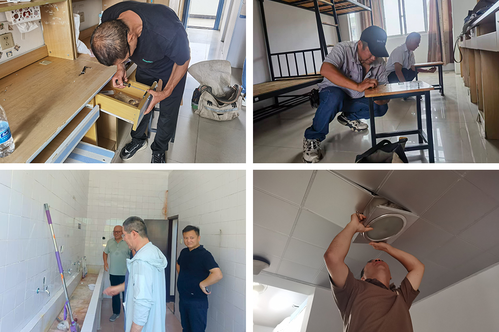 维修科在暑假期间对13栋小别墅及师源大厦的部分楼层进行了改造,争分夺秒焕新宿舍。迎新日派驻人员现场值守,及时处理水电、家具等常见问题。推广线上报修系统,实现扫码报修、进度可查,提升服务效率。