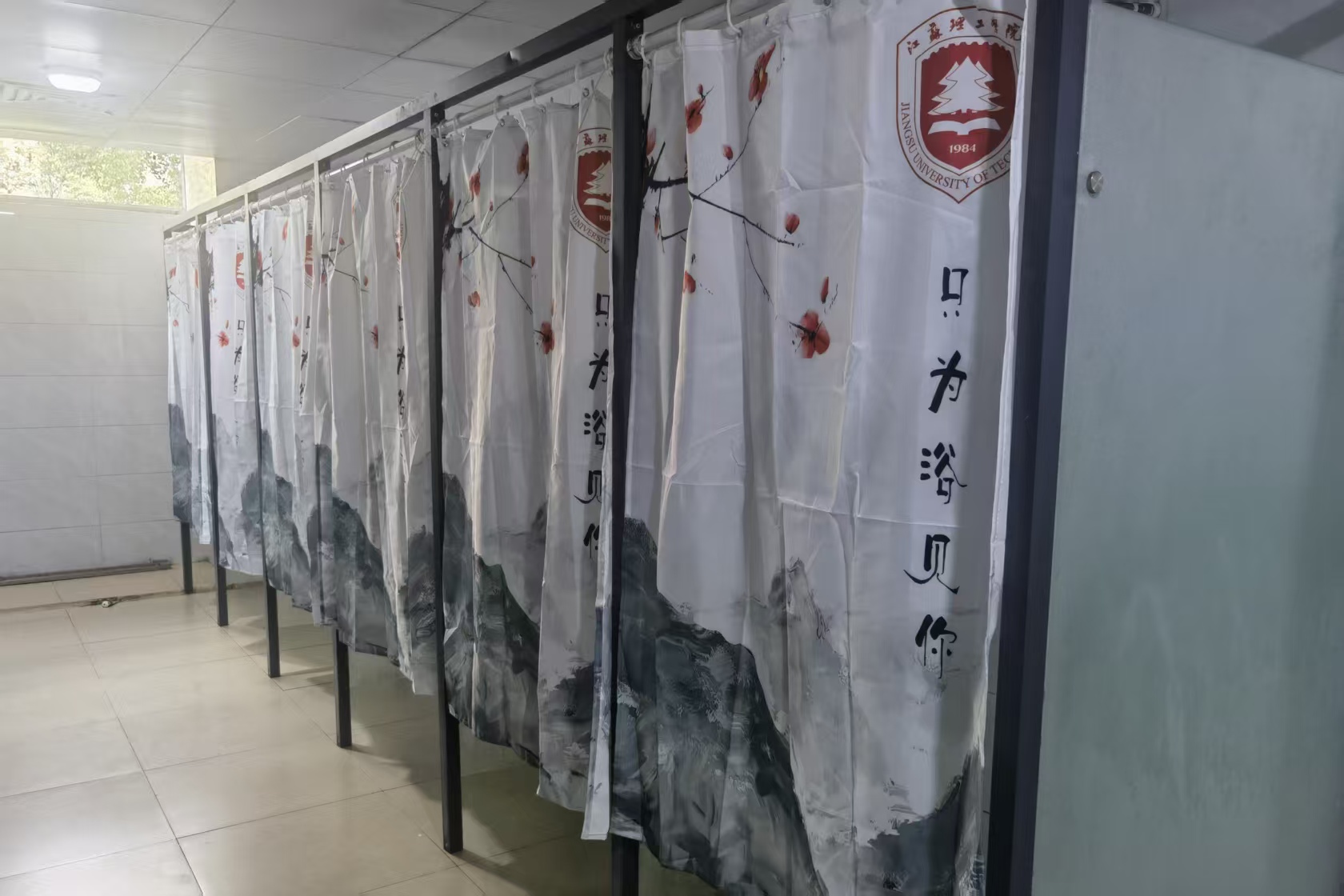 公共浴室原有浴帘因使用年限较长,出现了老化、污渍残留、甚至部分霉变等问题,虽经频繁清洗仍难以彻底解决,影响了浴室整体的美观和卫生状况。本次更换的新浴帘选用了加厚、防水防霉、易清洁的环保材料。此外,浴帘上印有学校的Logo和温馨的提示语,于细节处营造暖心氛围。