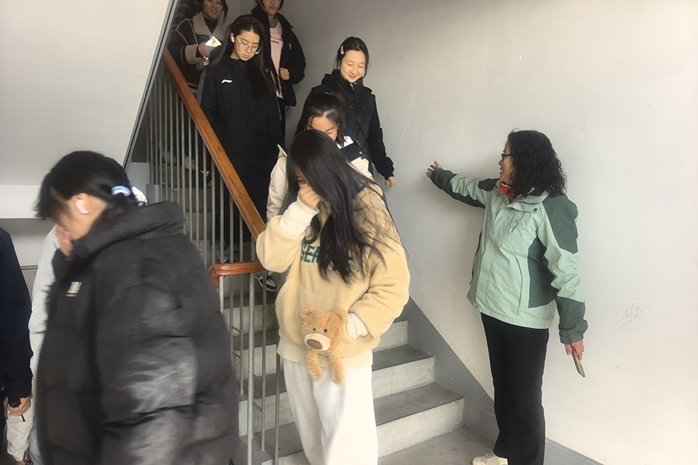 演练前,校保卫处消防专员进行现场指导,讲解并演示了浓烟环境下低姿匍匐、湿毛巾捂鼻等逃生技巧,同时明确演练疏散路线与集合点位。演练中,模拟宿舍楼道突发“火情”,各楼层安全员立即触发警报,学生在工作人员引导下,按照要求有序撤离,仅用时4分钟便全部安全抵达楼下指定集合点。